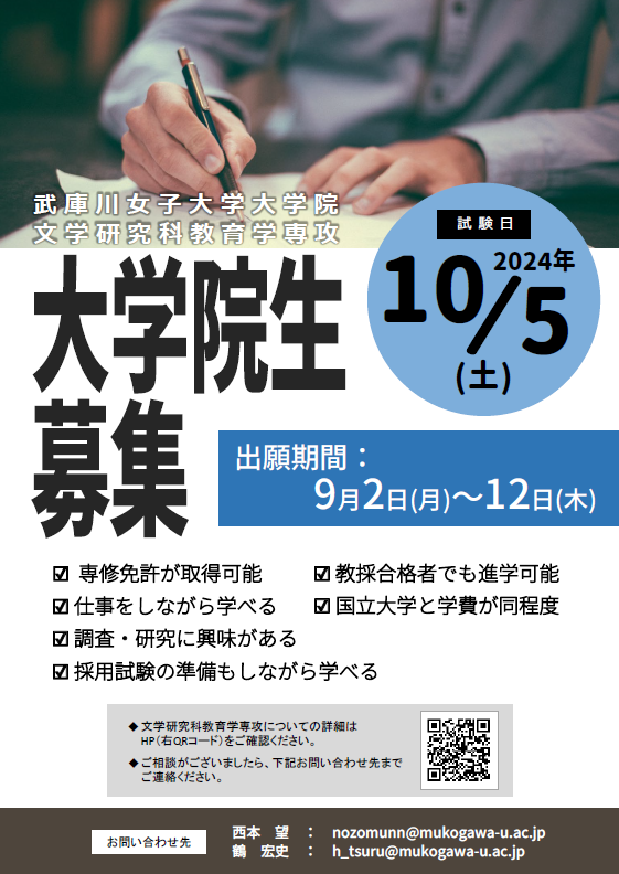 文学研究科 教育学専攻への進路等のご相談・お問い合わせは下記チラシをご覧ください。